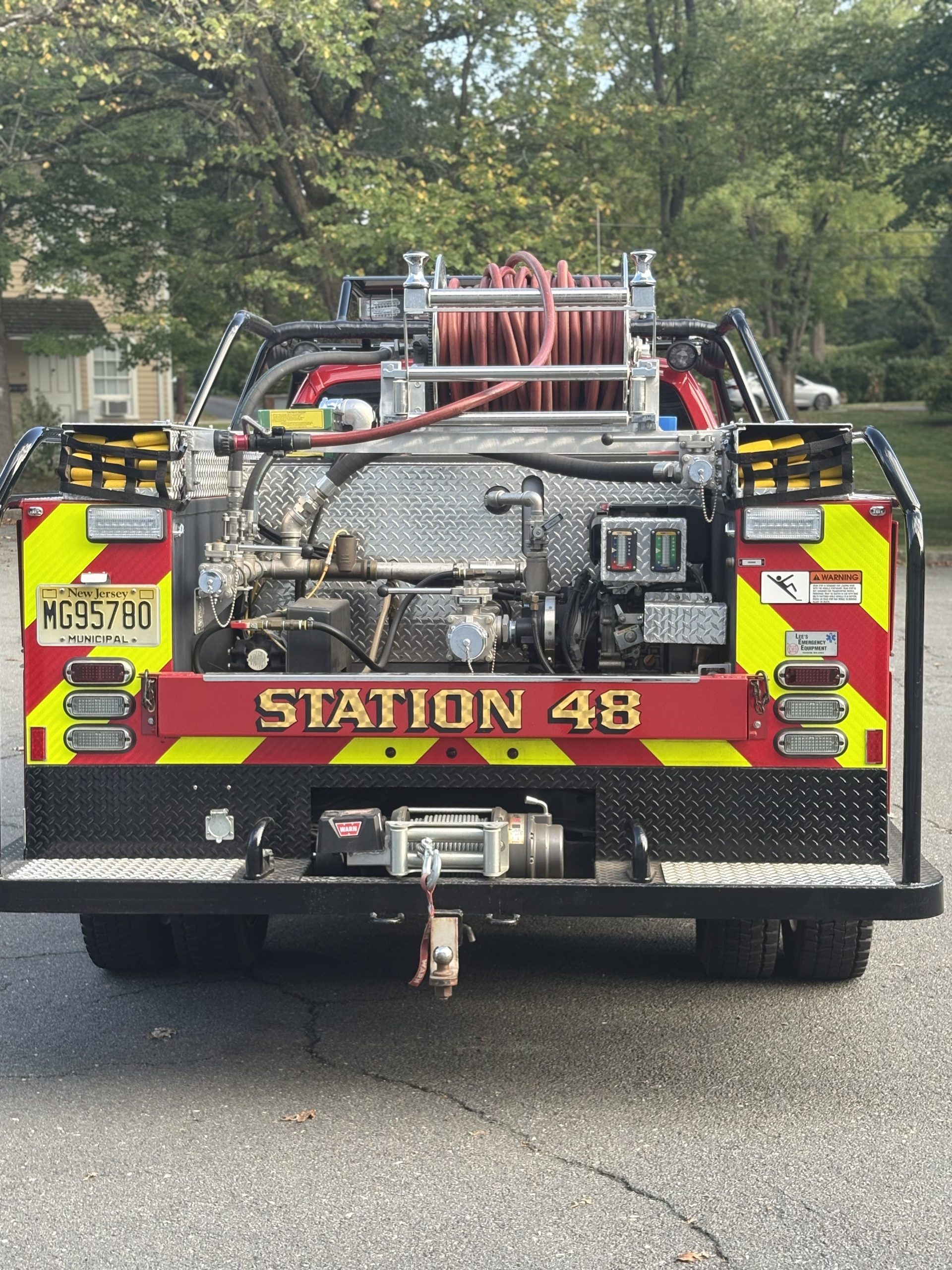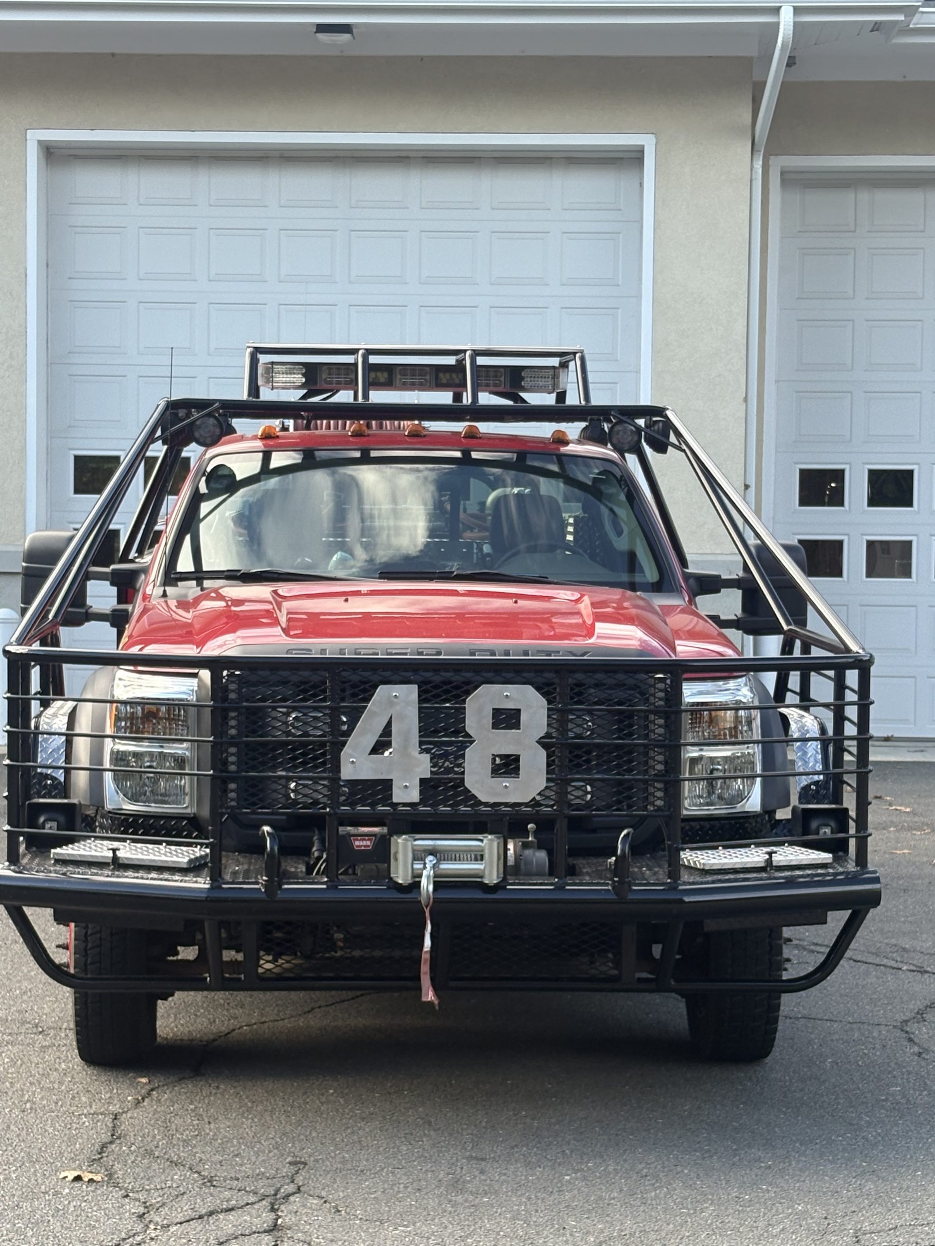 Brush 48 is a Ford F-450 with a custom utility body and pump designed for fighting fires in hard to reach areas or off-road. It is equipped with a 300-gallon water tank, a small tank for Class-A firefighting foam, as well as a pump and forestry-specific fire hose spooled on a reel on the back of the truck. It is also equipped with 4-wheel drive and a protective cage system to protect the truck when driving through the woods. The truck carries a chainaw, hand tools, lightweight firefighting gear, and basic fire extinguishers.