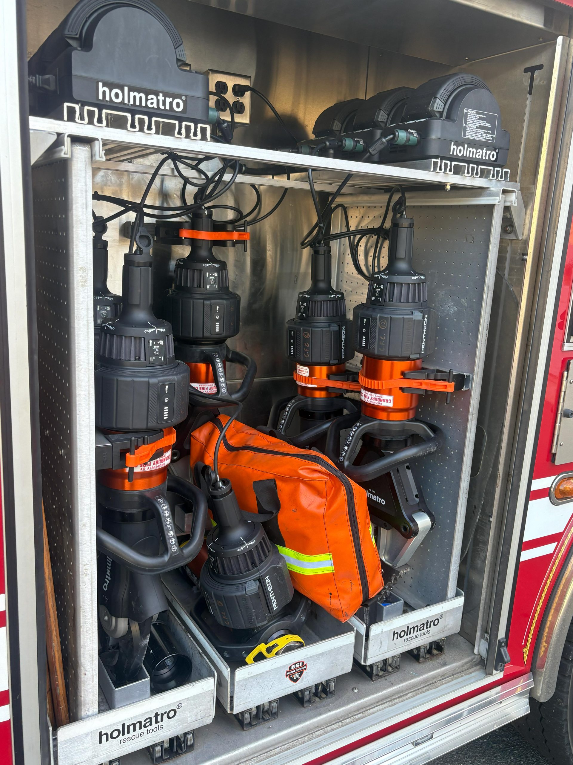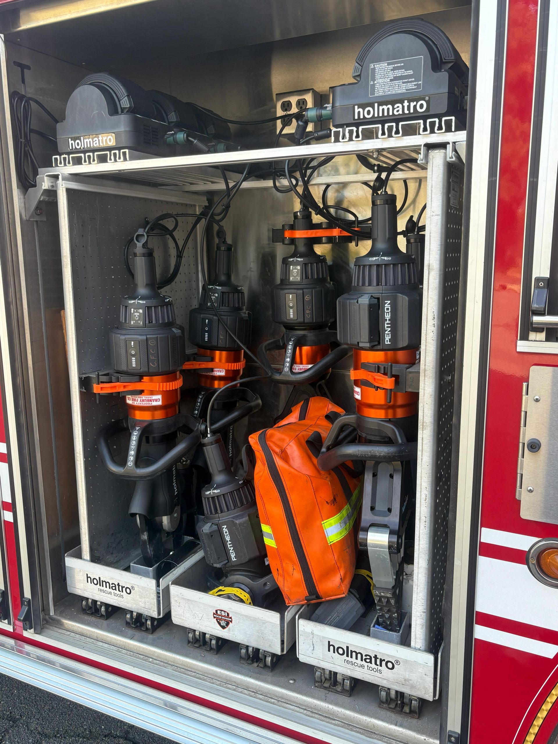 Rescue 48 is a 2007 Pierce Rescue Engine. It is the first due truck for accidents and rescue calls in town, and carries a compliment of Holmatro battery-powered rescue tools, air bags for lifting, struts, jacks, and cribbing for stabilizing cars, as well as many other common tools used for firefighting. The Rescue has seating for 6, an onboard generator, light tower, and air bottle refill station. It carries 750 gallons of water, 30 gallons of Class A and B foam.
